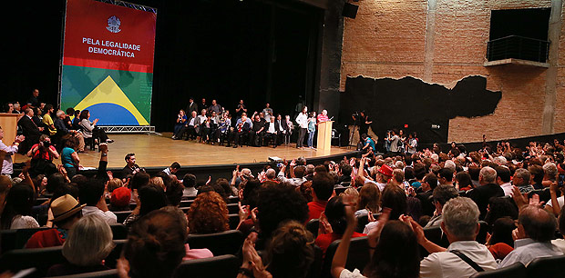 Movimentos e representantes em defesa da legalidade democrática e contra o golpe realizaram na noite de quarta (16/03) ato público no teatro Tuca, em São Paulo. O “Ato pela Legalidade Democrática” foi patrocinado pelo Centro Acadêmico 22 de Agosto, da PUC-SP, em parceria com o Fórum 21.