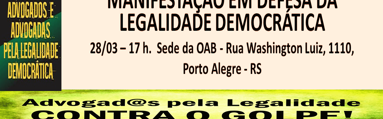 O o movimento Advogados e Advogadas está convocando para um ato na frente da OAB-RS para protestarmos contra o golpe e, mais especificamente para marcar a contrariedade da sociedade a subscrição por parte do Conselho de um pedido de impedimento da Presidenta Dilma Roussef sem base em crime de responsabilidade .