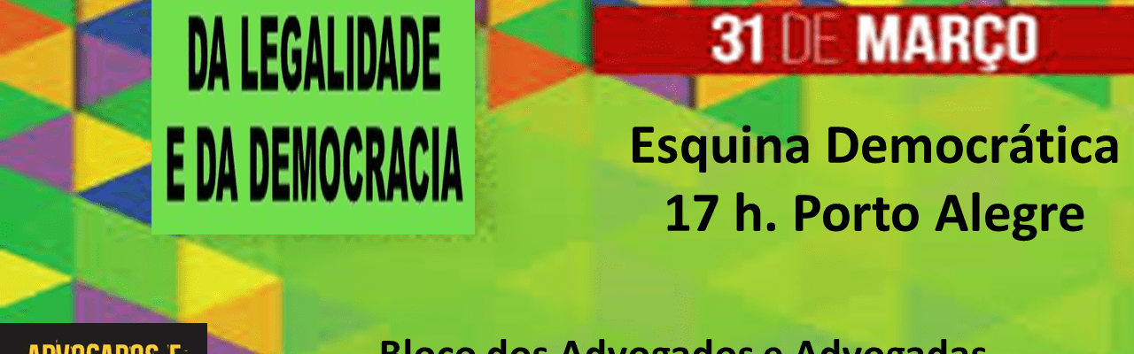 Vem Prá Democracia: 17 h. Esquina Democrática – Port Alegre Porto Alegre na resistência democrática. Hoje, 17 horas, na Esquina Democrática. Vem para a democracia! Compartilhe isso: Clique para compartilhar no Pocket(abre em nova janela) Pocket Clique para compartilhar no X(abre em nova janela) 18+ Clique para compartilhar no Facebook(abre em nova janela) Facebook Clique para enviar um link por e-mail para um amigo(abre em nova janela) E-mail Clique para imprimir(abre em nova janela) Imprimir Curtir Carregando... Relacionado