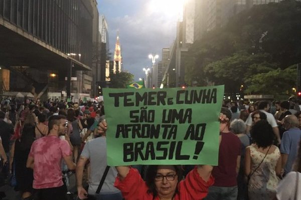 Posteriormente, os manifestantes se dirigiram para a frente da FIESP para protestarem contra o apoio dado pela entidade ao golpe em curso.