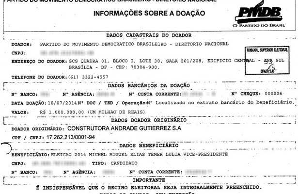 Na prestação de contas dos gastos de Temer em campanha –feita em conjunto com a prestação de Dilma–, aparecem doações feitas à campanha dele pelo Diretório Nacional do PMDB no valor de R$ 9,6 milhões. Desses, a Andrade Gutierrez aparece como doadora de R$ 1 milhão.