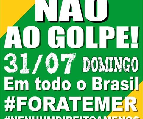 Hoje (31), a Frente Povo sem Medo concentra forças para a realização de atos em todo o Brasil e em várias cidades do exterior. Em São Paulo, a concentração está programada para iniciar às 14h no Largo da Batata, próximo à estação Pinheiros do metrô, na zona oeste. Em algumas capitais, como Distrito Federal e Belo Horizonte, a concentração já começou, na Feira Central de Planaltina e na Praça Sete, respectivamente. No Rio de Janeiro, os movimentos optaram por concentrar esforços para um grande ato no próximo dia 5, dia em que o mundo estará de olho na Abertura dos Jogos Olímpicos.