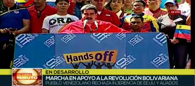 O presidente Nicolás Maduro fez, na tarde deste sábado (23), em Caracas para uma multidão, um discurso em que atacou duramente Donald Trump, seu opositor Juan Guaidó e convocou o povo para seguir ao seu lado. Maduro voltou a rejeitar a suposta “ajuda humanitária” capitaneada pelos Estados Unidos (“comida podre”) e reforçou, como tem dito,… Leia mais O golpe de Estado fracassou e a Venezuela esta em paz: leia íntegra do discurso de Maduro em Caracas e assista o vídeo